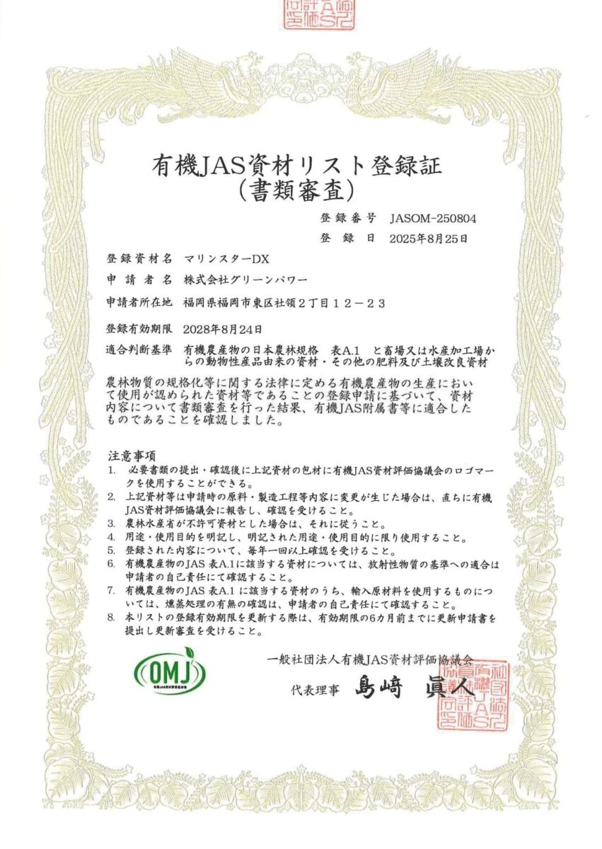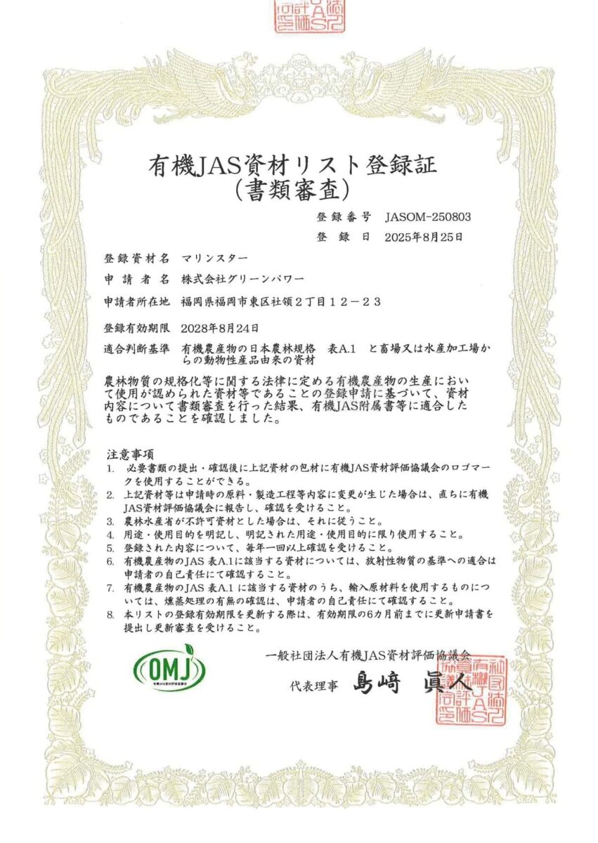 INFOお知らせ お知らせ有機JAS資材リストに認定登録いたしました 有機JAS資材リストの登録番号は以下の通りです。 マリンスター登録番号:JASON-250803 マリンスターDX登録番号:JASON-250804